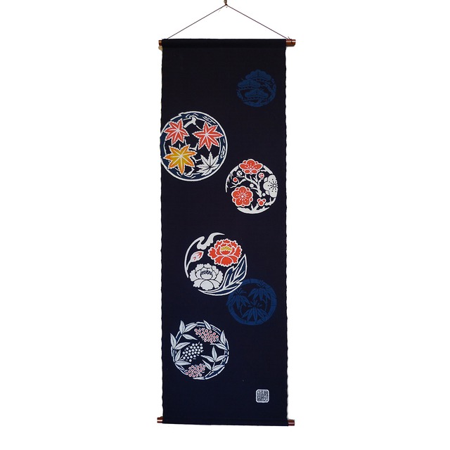四季の草花を丸く散らばめたタペストリーです。 季節に関係なく掛けていただけます。 上下に棒がついていますので、そのままお手軽に飾っていただけます。 筒描と呼ばれる紺屋伝統の技法を用いた壁掛け。白生地に手描きで餅糊を置いて図柄を描き、大豆の絞り汁(呉汁)に顔料を混ぜて彩色する。その後、発酵させた天然藍に何度も漬け込み、清流で水洗いし、天日干しする、昔ながらの染め方で製作。 サイズ:約50cm×160cm 素材 :綿100%