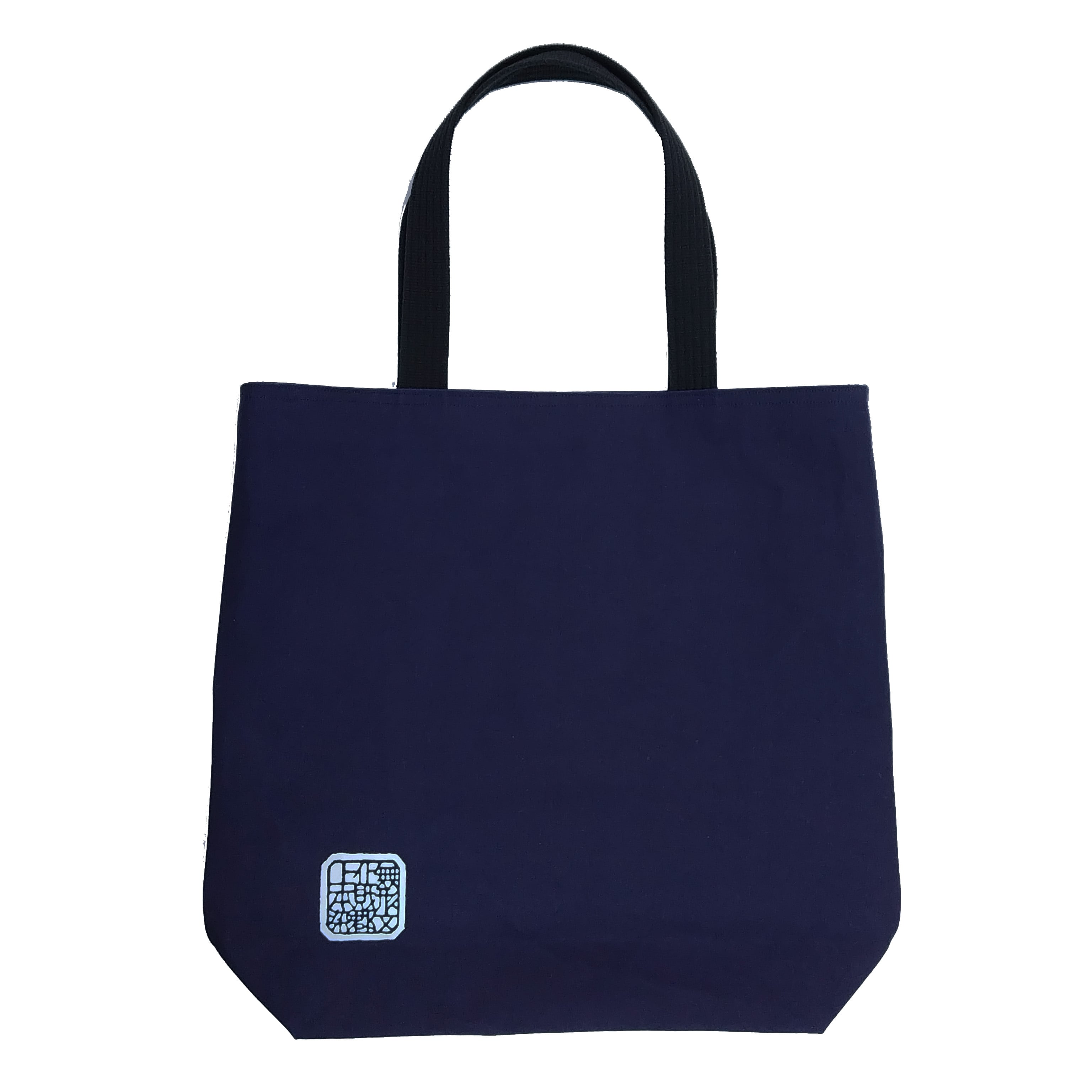 天然藍で濃紺に染め上げた帆布バッグ。白生地に餅糊を置いて図柄を描き、大豆の絞り汁(呉汁)に顔料を混ぜて彩色する。その後、発酵させた天然藍に何度も漬け込み、清流で水洗いし、天日干しする、昔ながらの染め方で製作。