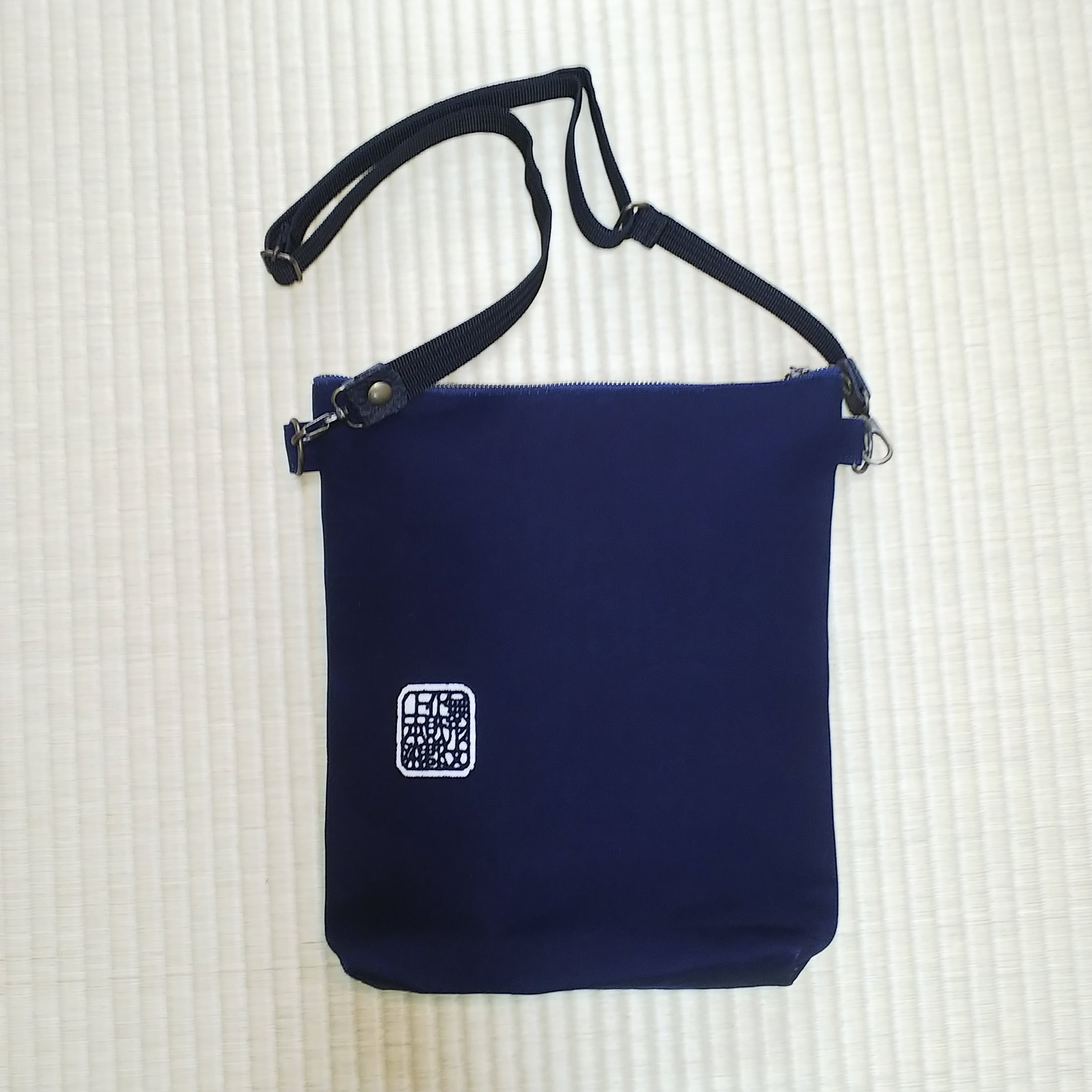 天然藍で濃紺に染め上げたショルダーバッグ。持ち手は本皮を使用。白生地に餅糊を置いて図柄を描き、発酵させた天然藍に何度も漬け込み、清流で水洗いし、天日干しする、昔ながらの染め方で製作