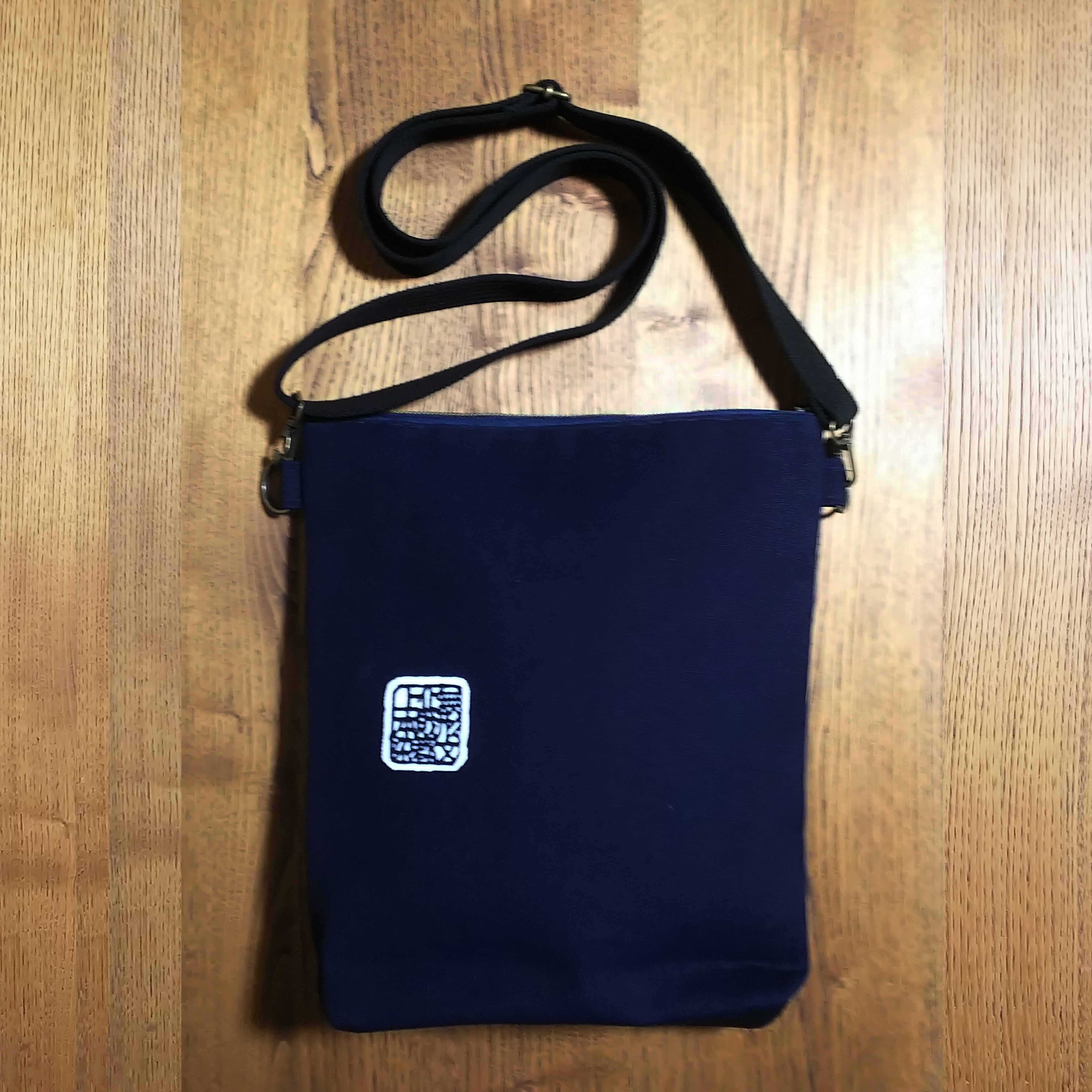 天然藍で濃紺に染め上げたショルダーバッグ。持ち手は本皮を使用。白生地に餅糊を置いて図柄を描き、発酵させた天然藍に何度も漬け込み、清流で水洗いし、天日干しする、昔ながらの染め方で製作
